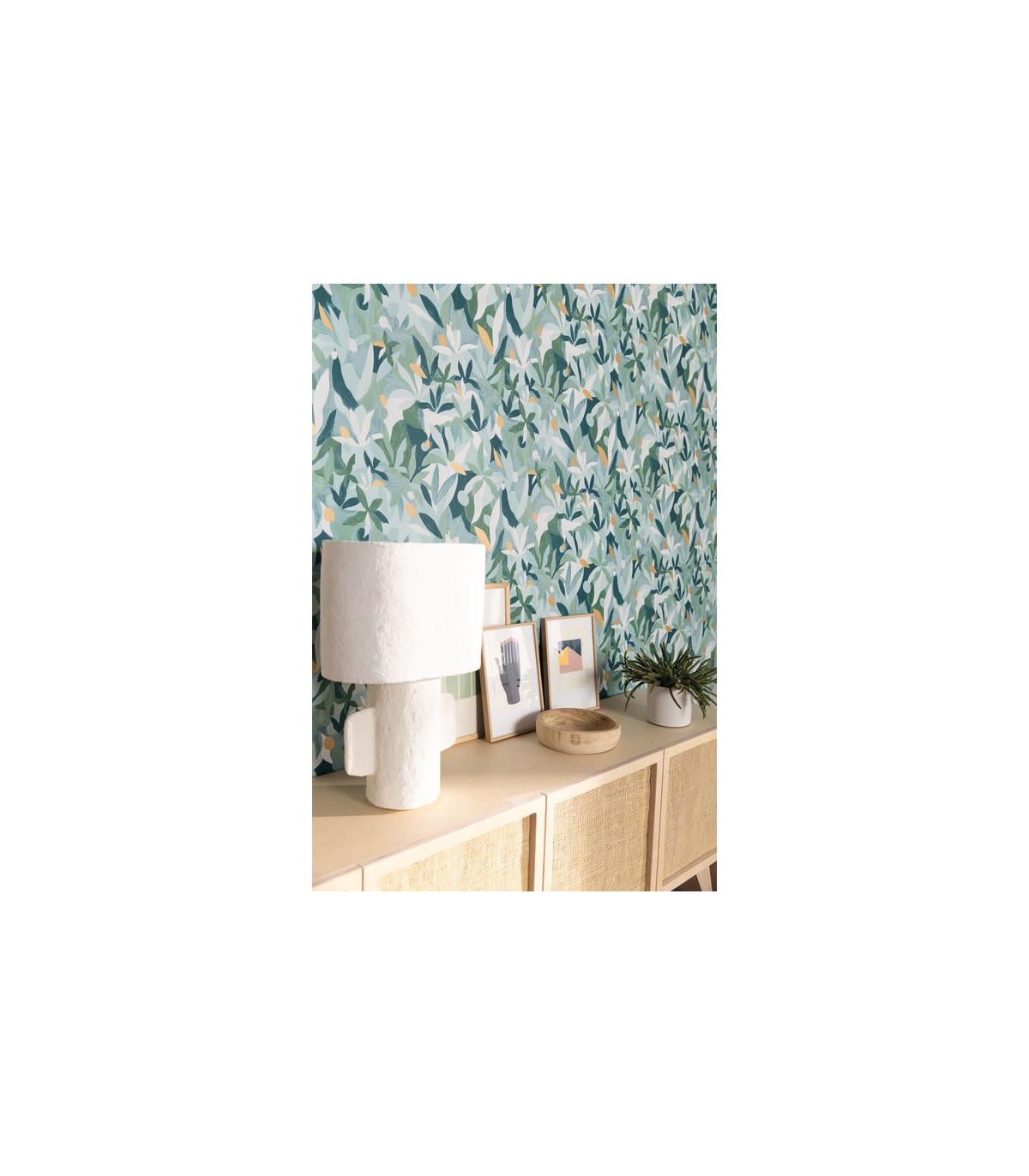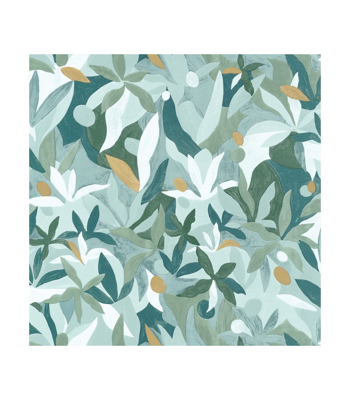 Papel pintado con flores pequeñas en tonos verdes y dorado con fondo negro.