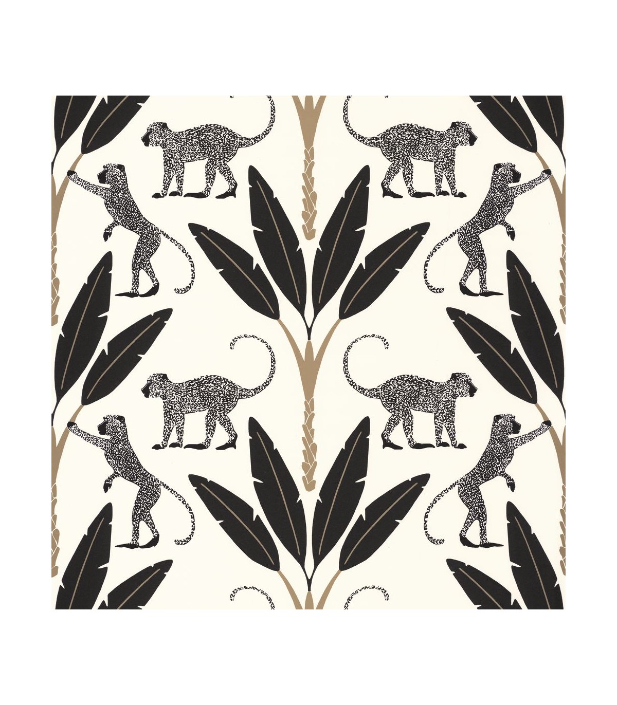 Papel pintado hojas y monos en tonos blanco, negro y dorado.