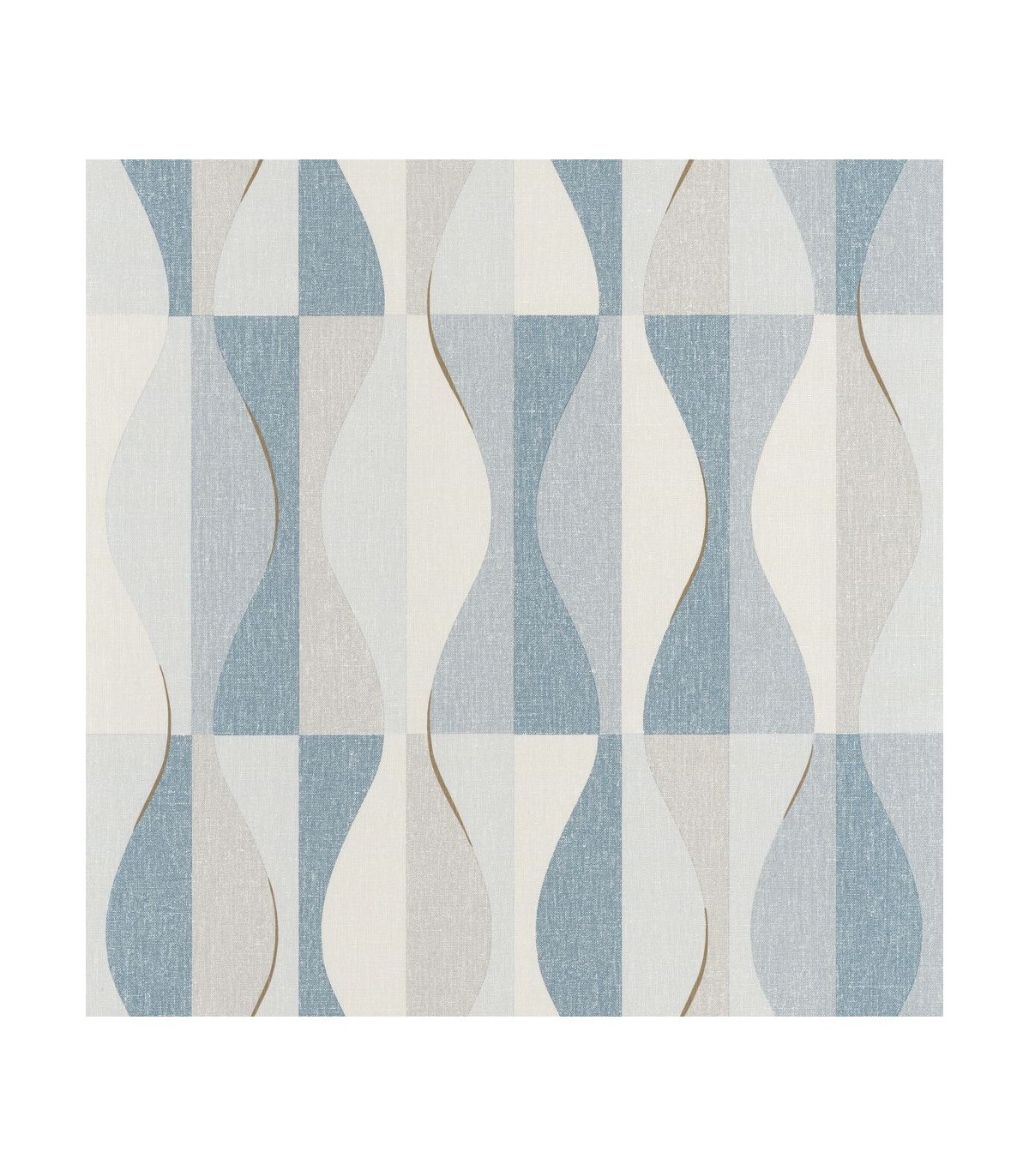 Papel pintado con dibujo ondulado grande en tonos azul y dorado.