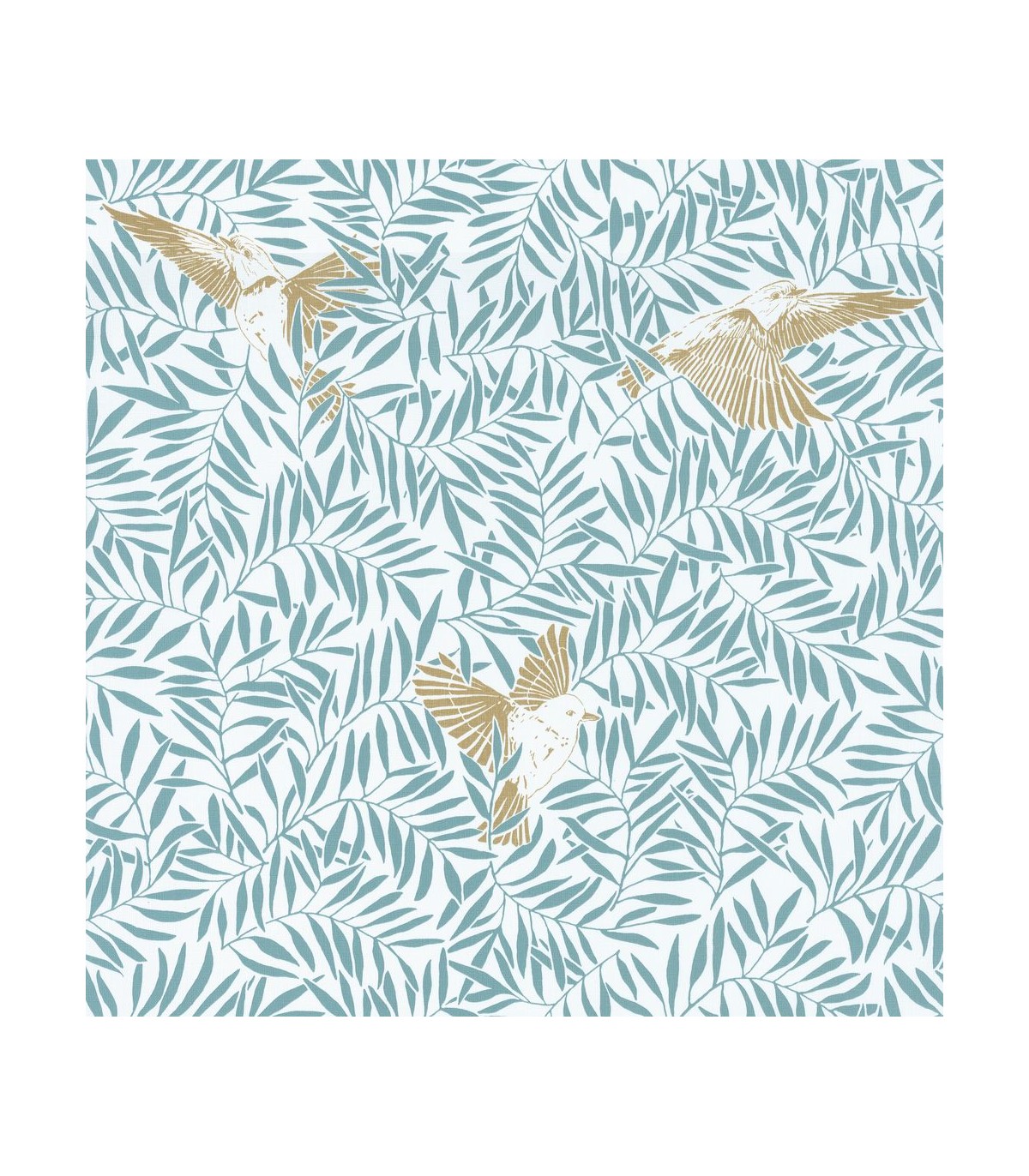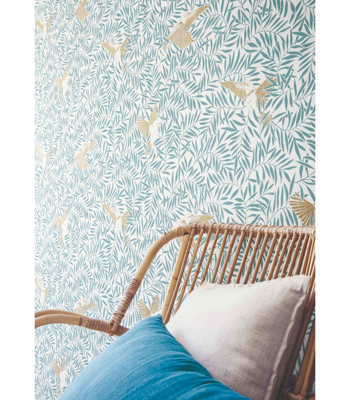 Papel pintado estilo nórdico con hojas azules, pájaros dorados y fondo blanco.